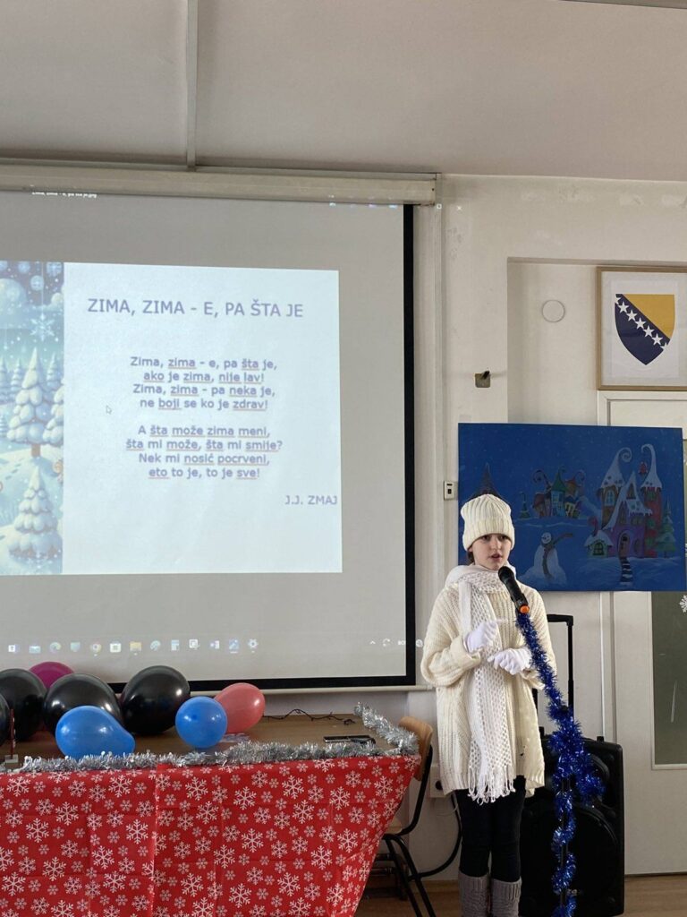Umjetnički dio programa bio je pravo praznično slavlje. Naši najmlađi iz predškolske grupe raznježili su nas pjesmom “Padaj, padaj snježiću” , učenici predmetne nastave recitacijom “Zima, zima, e pa šta je”, dok su srednjoškolci kroz igrokaz “Zlatna ribica” podsjetili na ljepotu mašte i vrijednost prijateljstva. Poseban šarm donijeli su naši “Mali manekeni” iz razredne nastave, čiji su osmijesi i sigurni koraci osvojili srca prisutnih.