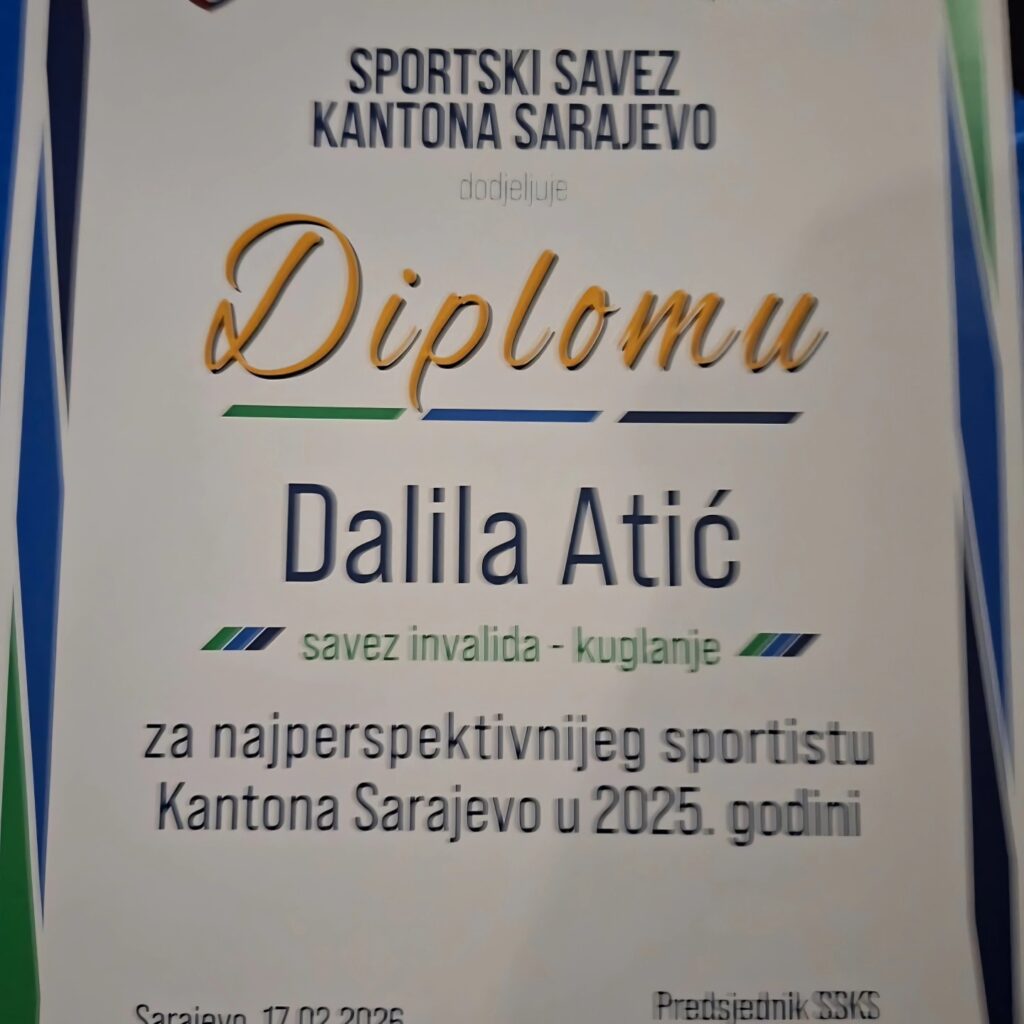 Naša učenica Dalila Atić, članica Udruženje za sport i rekreaciju invalida Novi Grad Sarajevo , osvojila je prestižno priznanje za najperspektivniju sportistkinju u disciplini kuglanje.