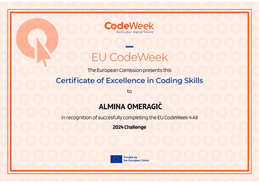 S ponosom objavljujemo da su naši učenici odjeljenja 1-1 i 3-1, pod vodstvom tadašnje učiteljice, a sadašnje direktorice našeg Centra, Belme Hamzić, ostvarili izvanredan uspjeh i dobili Certifikat izvrsnosti u okviru EU Code Week 4 All izazova!