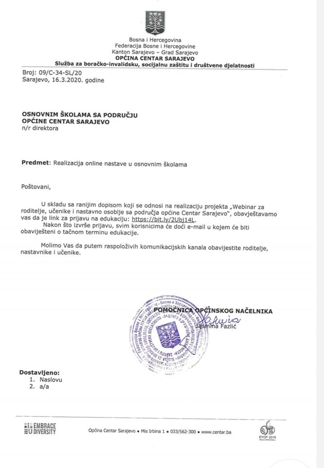 Obavještenje-Webiner za učenike, roditelje i nastavno osoblje sa područja Općine Centar