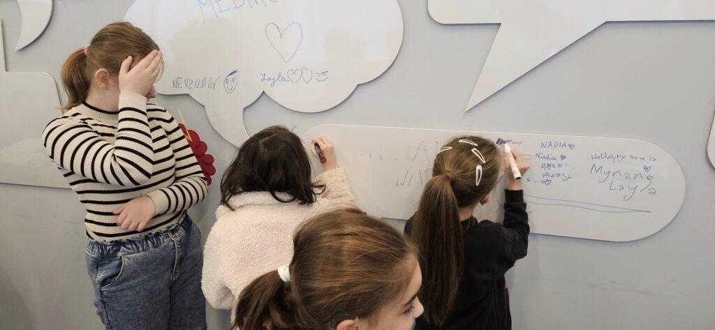Učenici su uživali u bogatom programu koji su im pripremili naši ljubazni domaćini. Prvo su pogledali zanimljive slikovnice i edukativni video o sigurnosti na internetu, a zatim su učestvovali u kreativnim aktivnostima. Mlađi učenici su crtali znakove po izboru, a kasnije su izražavali sreću kroz svoje crteže. Naše starije učenice su se okušale u kvizu znanja, gdje su pokazale zavidno poznavanje tema medijske pismenosti.