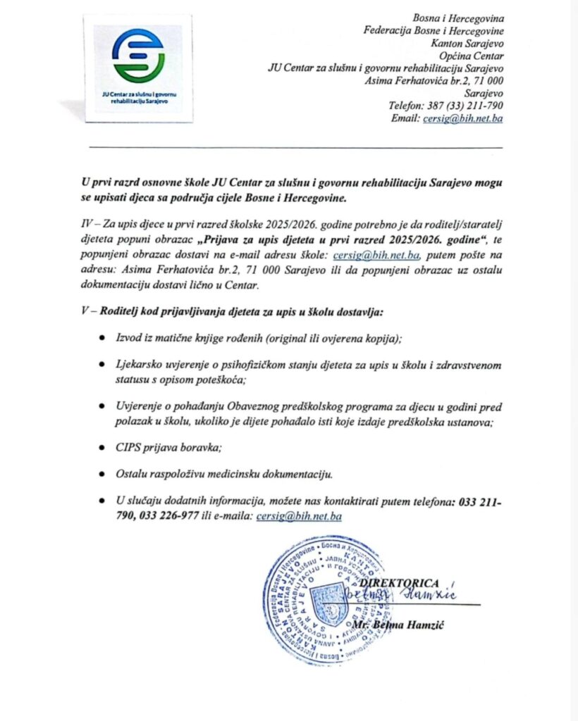 obavještavamo vas da se upis djece u prvi razred osnovne škole za školsku 2025/2026. godinu u JU Centar za slušnu i govornu rehabilitaciju Sarajevo u avgustovskom upisnom roku vrši u periodu od 1.8. do 30.8.2025. godine.