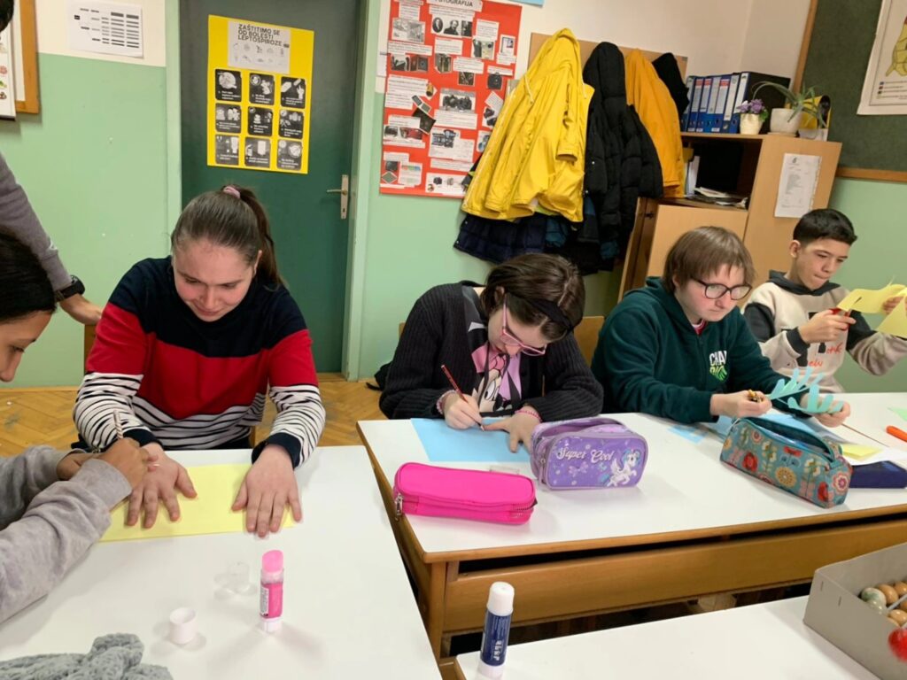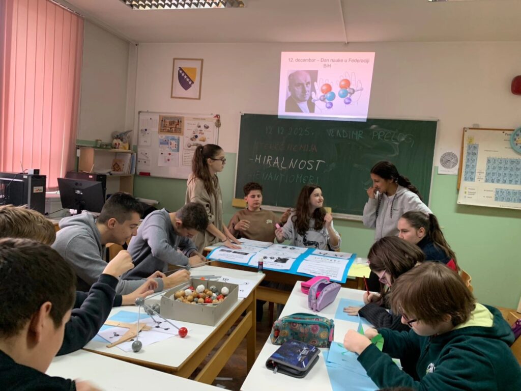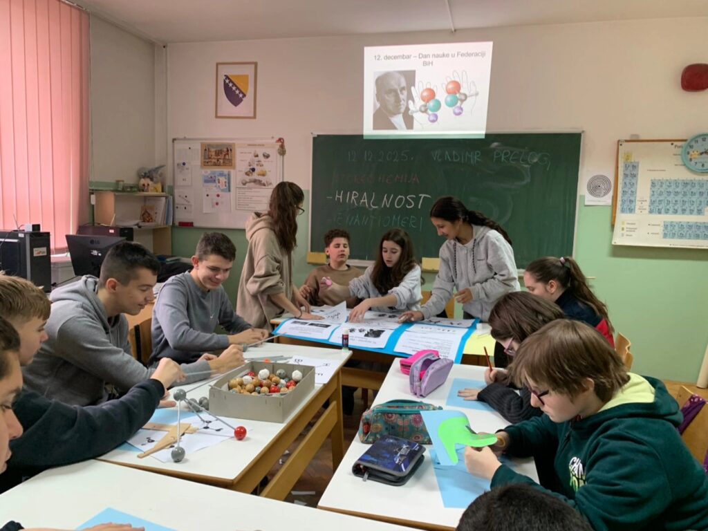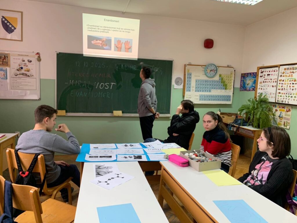 Nakon prezentacije, realizovali smo kratku radionicu u kojoj su učenici crtali i izrađivali modele molekula te kroz praktičan rad istraživali pojmove hiralnosti i prostorne građe molekula – oblasti po kojima je Prelog posebno poznat.