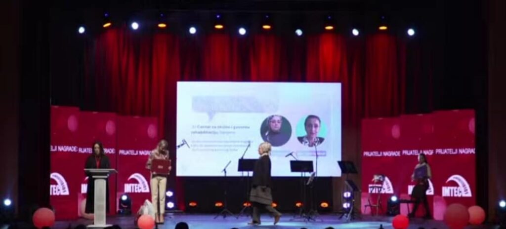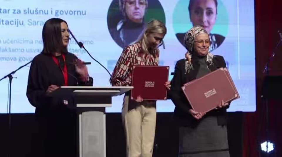 Dodjela nagrada za inovativne nastavnike u organizaciji COI Step by Step održana je sinoć u Mostaru. Praksa pod nazivom “Web aplikacija za učenike oštećenog sluha” koju su predstavile naša direktorica Meliha Povlakić Hadžiefendić i profesorica Mejrema Ljevaković, osvojila je sinoć Specijalnu nagradu za primjenu IKT u nastavi, među svim nominovanim praksama u svim kategorijama. Ponosni smo na uspjeh naših predstavnica i upućujemo iskrene čestitke našoj direktorici i profesorici Mejremi na osvojenoj nagradi i prezentaciji kako svoje prakse tako i naše ustanove i želimo im puno uspjeha u daljem radu.