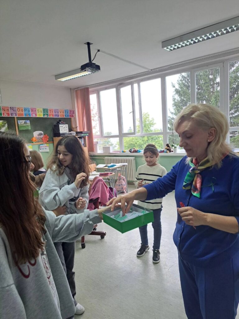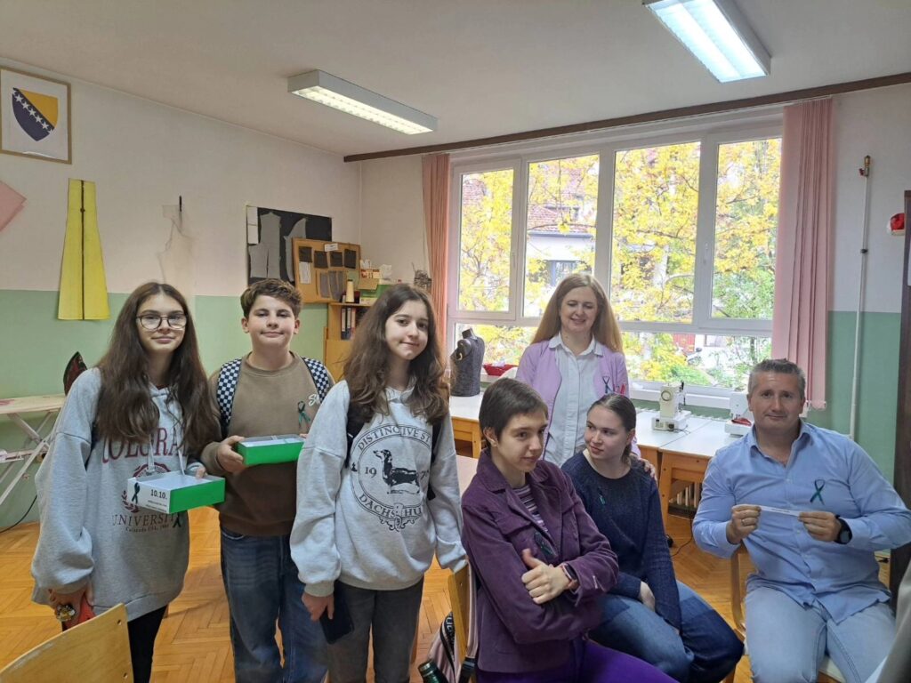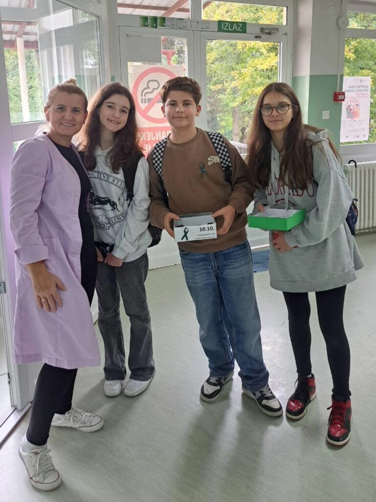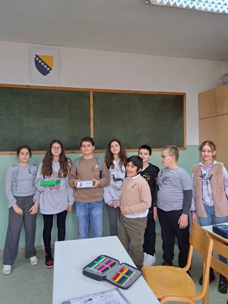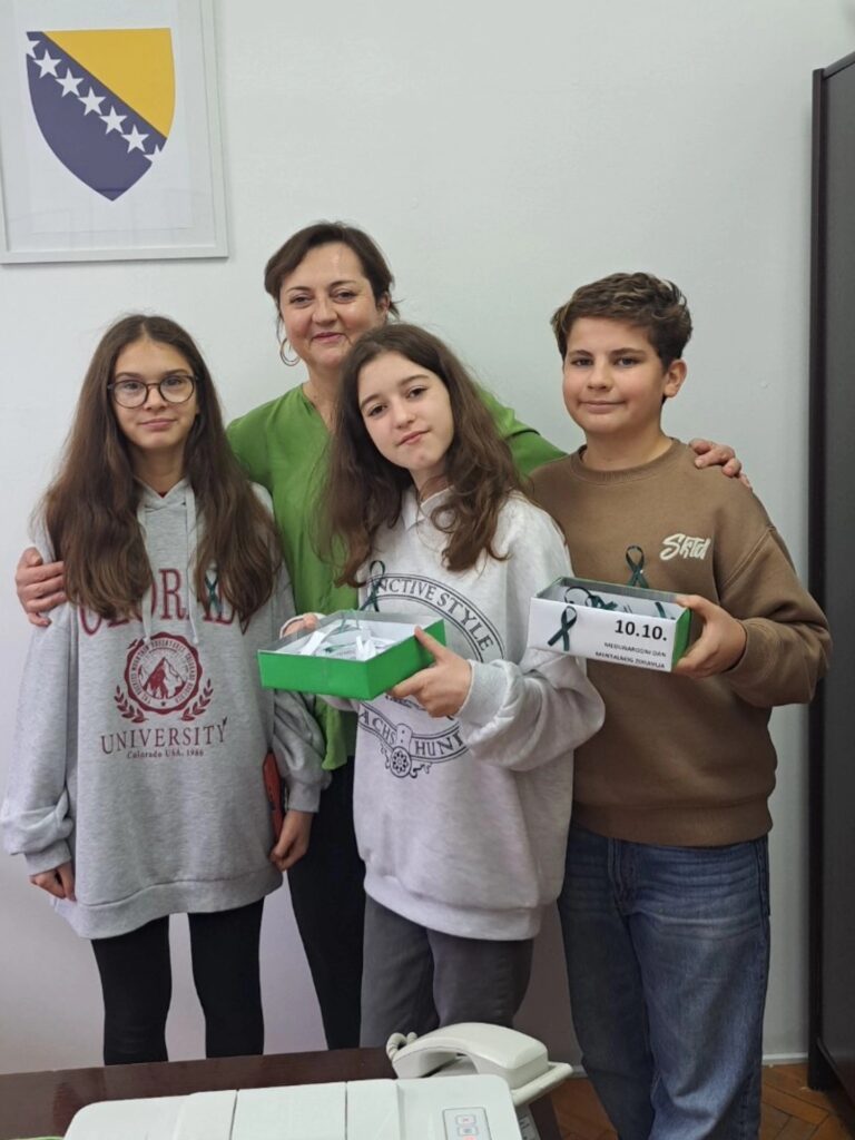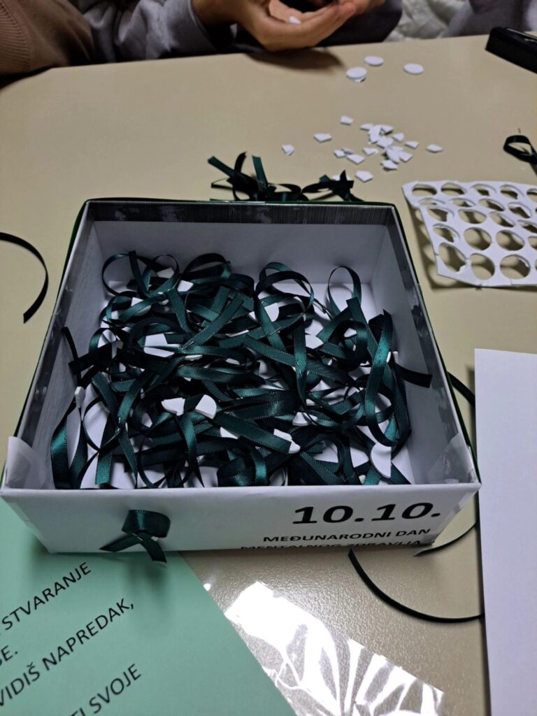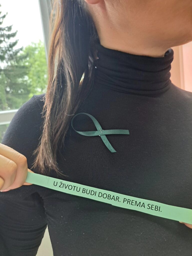 Stoga je danas i u našoj ustanovi obilježen ovaj važan dan. Učenici VIII-1 razreda su zajedno sa psihologom ustanove izradili zelene vrpce kao međunarodni simbol solidarnosti i podrške mentalnom zdravlju u cilju smanjenja stigme i diskriminacije. Zajedno su obišli sve učenike i uposlenike naše ustanove, te im uručili vrpce sa prigodnim i lijepim porukama za ovaj dan.