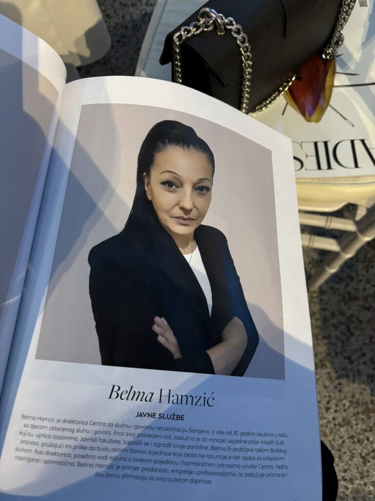 Iz dubine srca hvala mom sjajnom timu JU Centar za slušnu i govornu rehabilitaciju Sarajevo, bez vas nijedna moja ideja ne bi imala krila, nijedan san ne bi postao stvarnost. Hvala svima koji su na mom putu bili oslonac, riječ podrške i ruka koja me je podizala kada je bilo najteže.